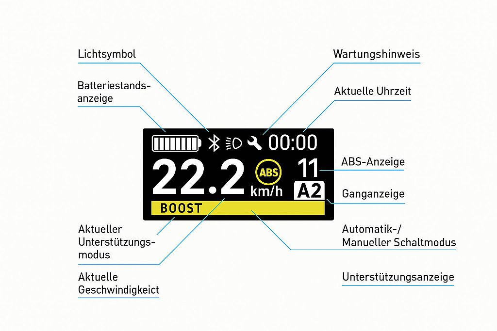 Das Display zeigt dir die verbleibende Akkuladung und den aktuellen Unterstützungsmodus auf einen Blick. So weisst du immer genau, wie weit du kommst – und kannst entspannt unterwegs sein, ohne Rechnen oder Raten.