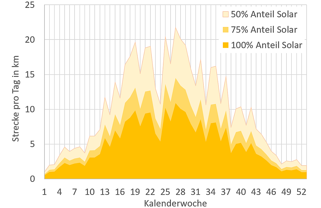 Der Prototyp des DXS 5.0 Solar zeigt seinen Nutzen im Sommer als effektiver Sonnenschutz und sammelt Energie, sobald er in der Sonne steht. Sicher ist: Die Umwandlungsverluste, die bei der Einspeisung ins Netz und beim Bezug aus dem Netz entstehen, entfallen. Mit den Testdaten unserer alten Solarfahrzeuge haben wir errechnet, dass an einem sonnigen Sommertag mit dem DXS 5.0 Solar über 12 km Betrieb aus bordeigener Solarenergie möglich sind.
