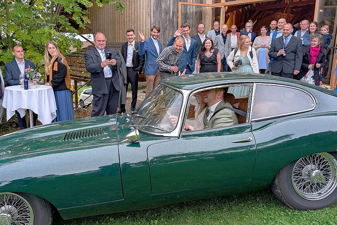 The celebrations continued in style: the bride and groom drove to the venue in a classic Jaguar, accompanied by many waving guests. An all-round successful day!